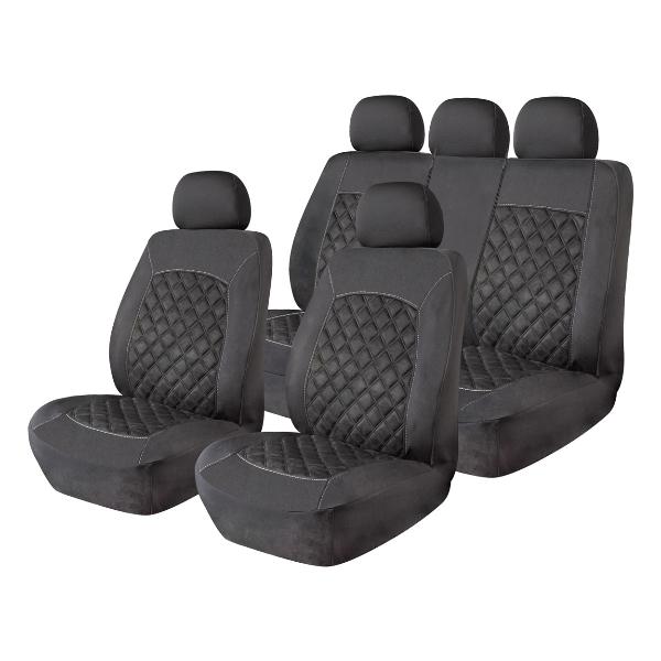 Juego completo de fundas para los asientos delanteros y traseros de un vehículo de pasajeros. Fabricadas en material duradero con alta resistencia a la abrasión y la suciedad, con inserciones acolchadas en gris y negro. Las fundas son aptas para asientos con airbags, ya que no bloquean su funcionamiento. Cuentan con aberturas para los reposacabezas y los cinturones de seguridad. La parte trasera de las fundas está totalmente cubierta, lo que garantiza la protección de los asientos delanteros, un aspecto estético y una mayor durabilidad.
